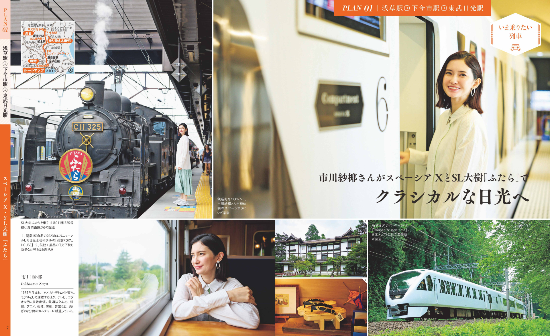 巻頭では、鉄道好きとして知られるタレント市川紗椰さんが「スペーシアX」と「SL大樹『ふたら』」を乗り継いで日光まで旅した様子をご紹介。