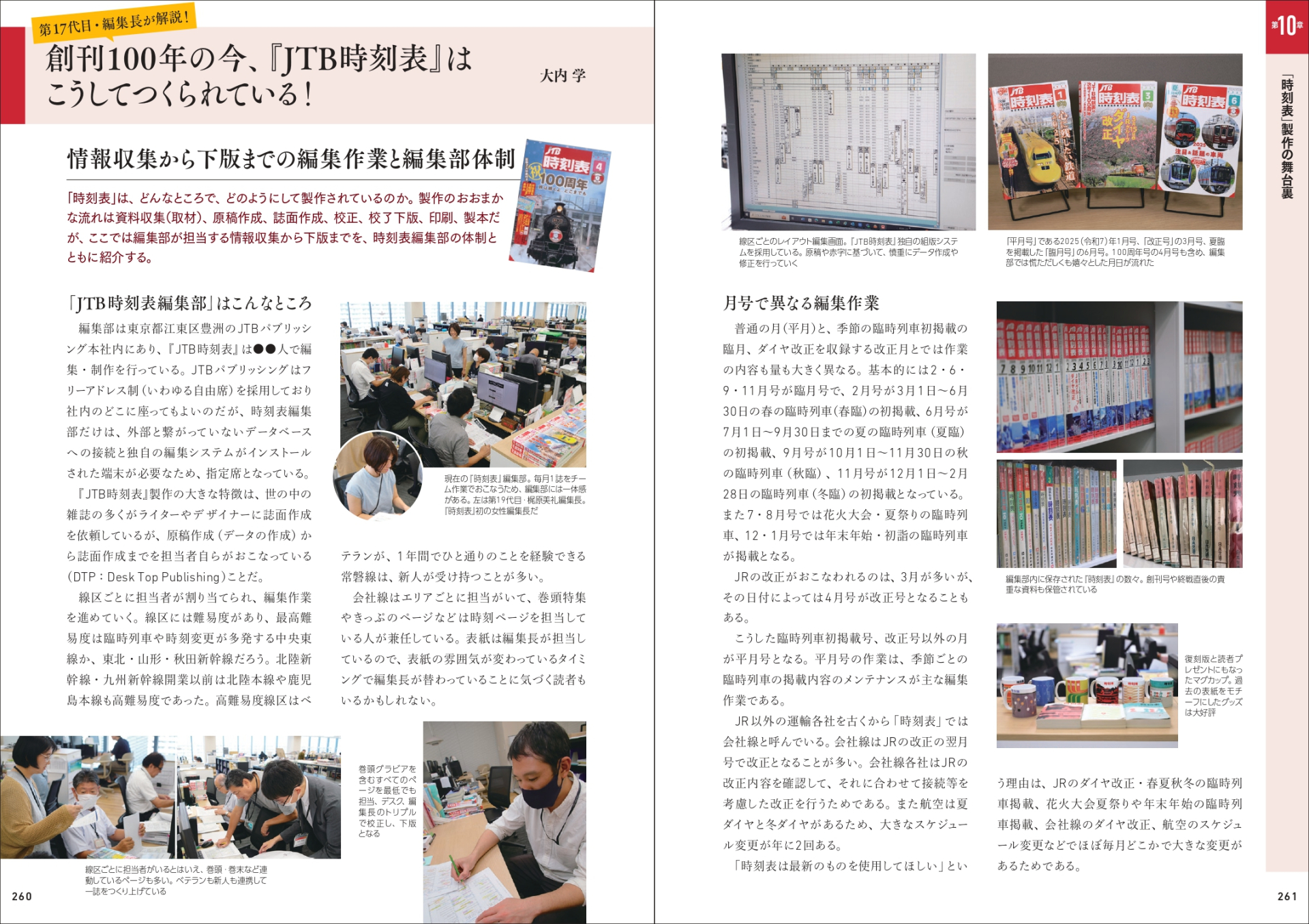 ●100年にわたって時刻表はどのようにつくられてきたのか、その制作舞台裏を編集部や関係者・愛読者の証言とともに収録しています。