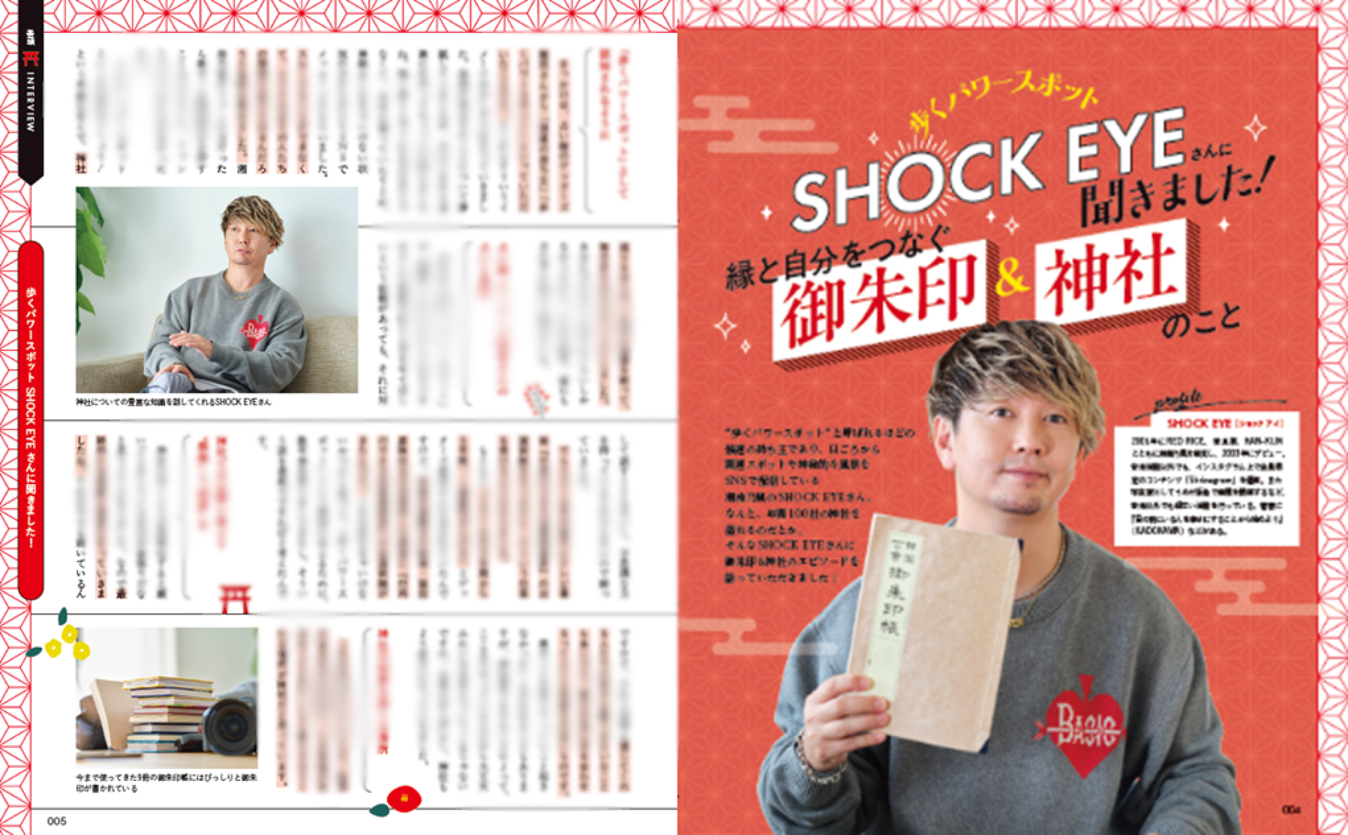 巻頭では、湘南乃風SHOCK EYEさんが登場。年間100社の神社を訪れるSHOCK EYEさんが「縁と自分をつなぐ御朱印&神社のこと」をテーマに、神社と御朱印、さらには授与品の魅力を語ります。