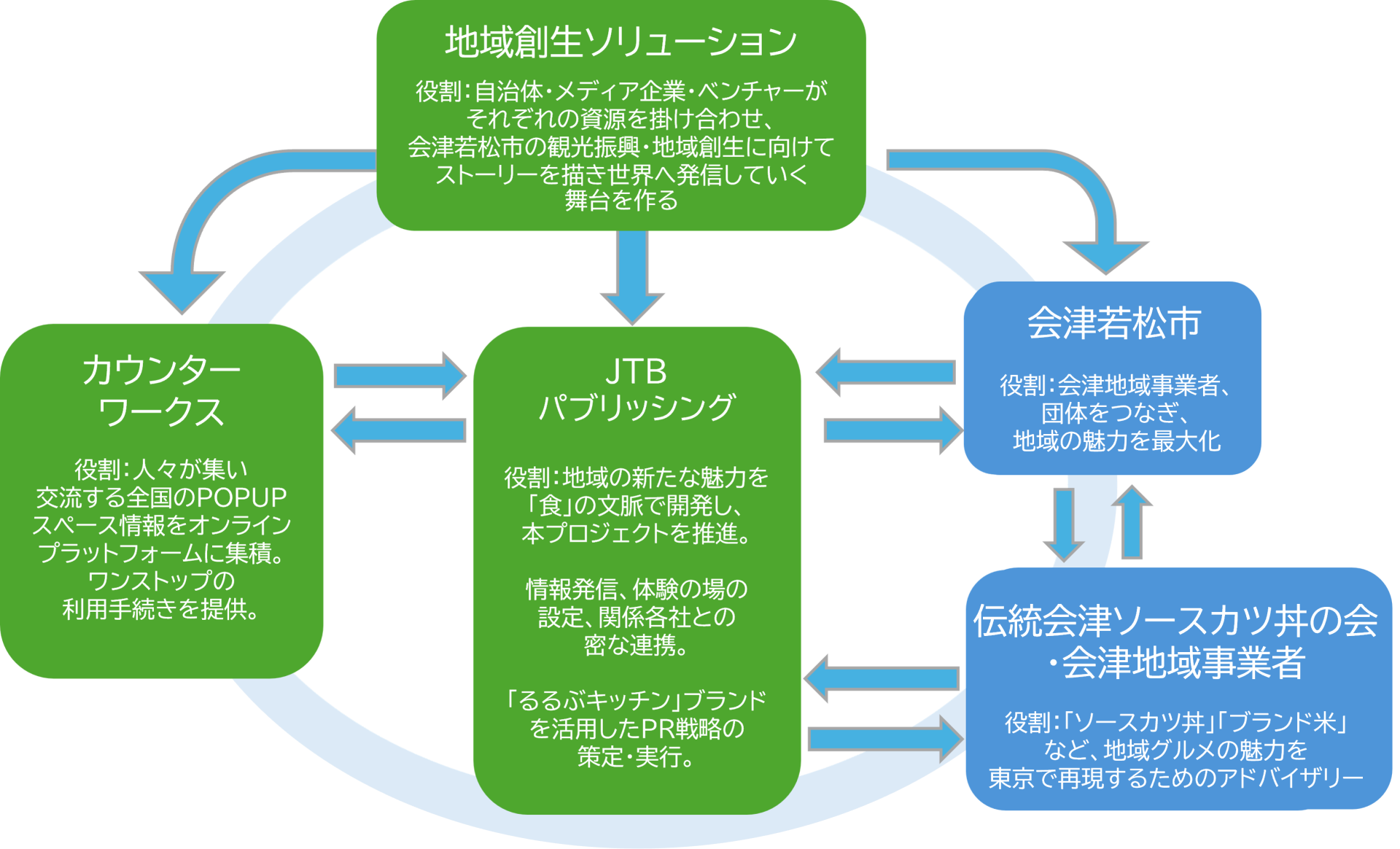 本取り組みは、RSSが主体となり、地域創生・地域振興を目的とした施策を、株式会社JTBパブリッシングおよび株式会社カウンターワークスとの連携の下で行う事業です。都市部のオープンスペースを活用して「地域の食」をフックとした情報発信や体験の場を設けることで地域活性の一助となることを図ると共に、プロモーション事業の実効性向上や取り組みの拡大を図ります。