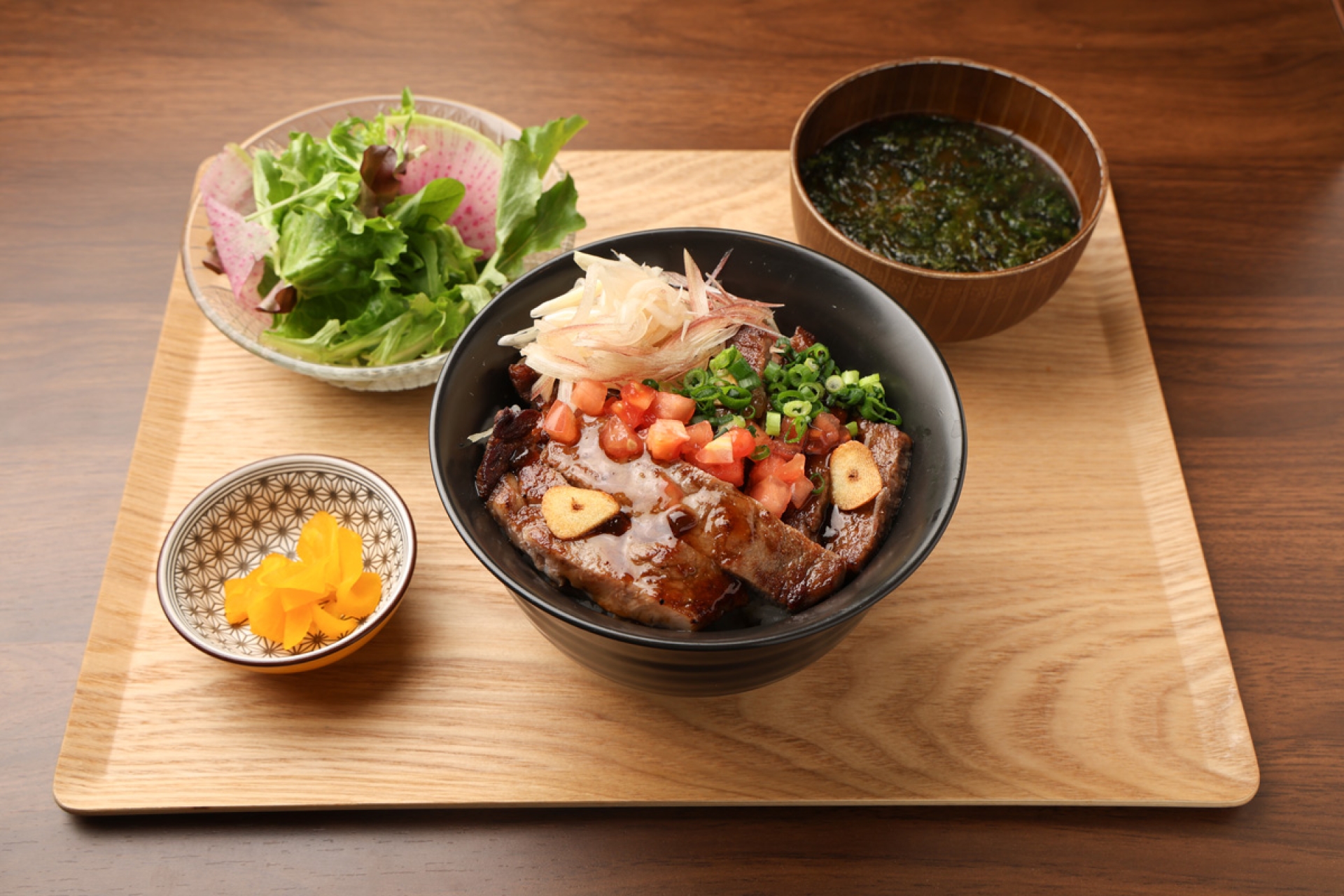 日本食肉格付協会「枝肉肉質ランク」の最上級格付5等級と上位格付4等級を獲得した黒毛和牛。その中から、生後28カ月以上、霜降り度合いが高いものが「和王」です。この「和王」を約150g使用したボリューム満点のステーキ丼。トッピングは「和王」を引き立てるトマトやミョウガを使用しました。ステーキソースには熊本産の晩白柚果汁も使用しています。
