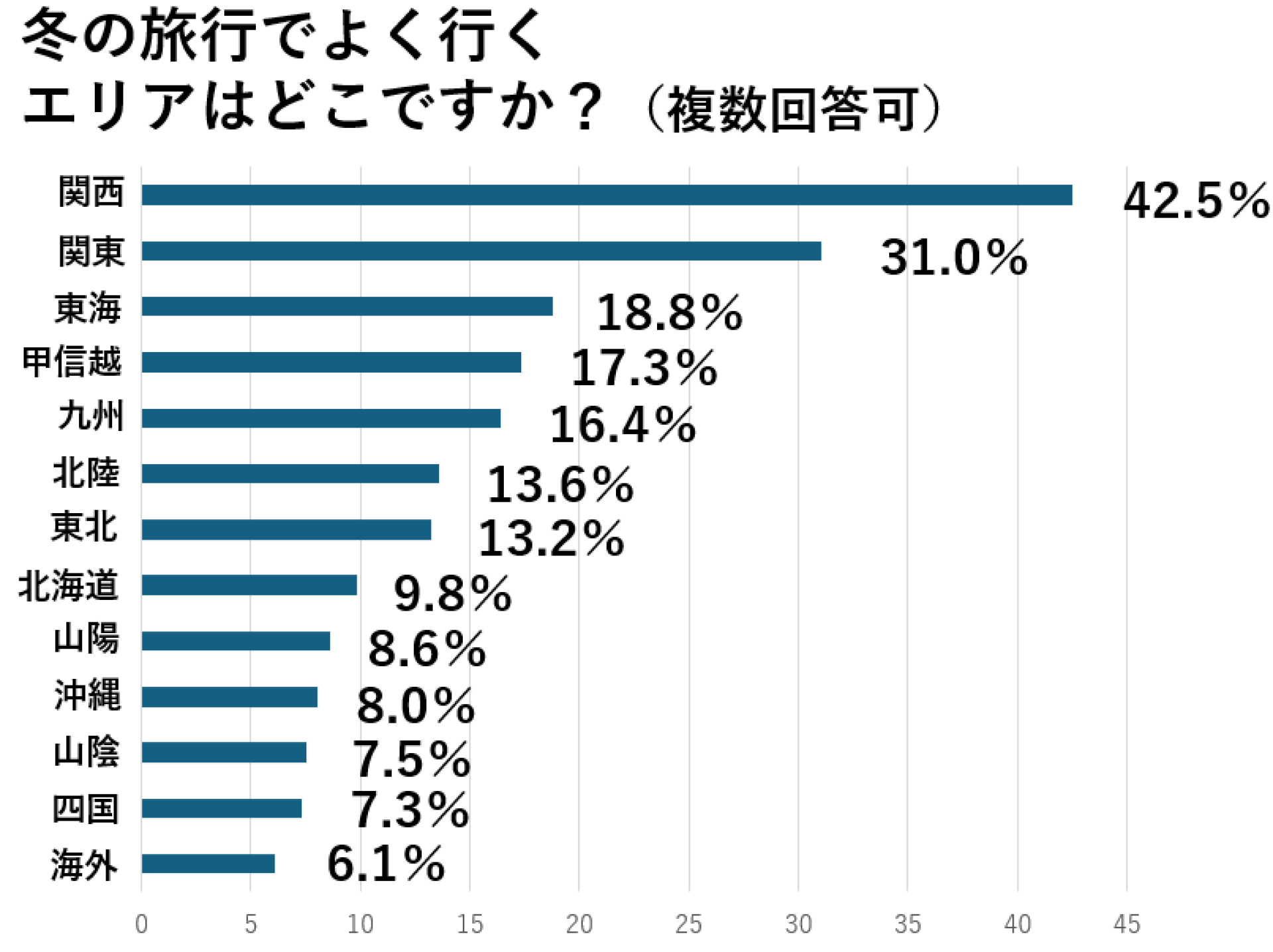 「冬の旅行でよく行くエリアは?」という質問をしたところ、関西エリアが1位となり、次いで関東、東海、甲信越、九州と続きました。具体的には、「冬の特別拝観のために京都へ」、「永平寺へ雪景色を見に」、「カニを目的に福井県三へ」、「東海岸、南伊豆、修善寺など伊豆半島の温泉地」、「奥日光などのバードウォッチングができるところ」といったコメントが挙がっていました。(n=590)