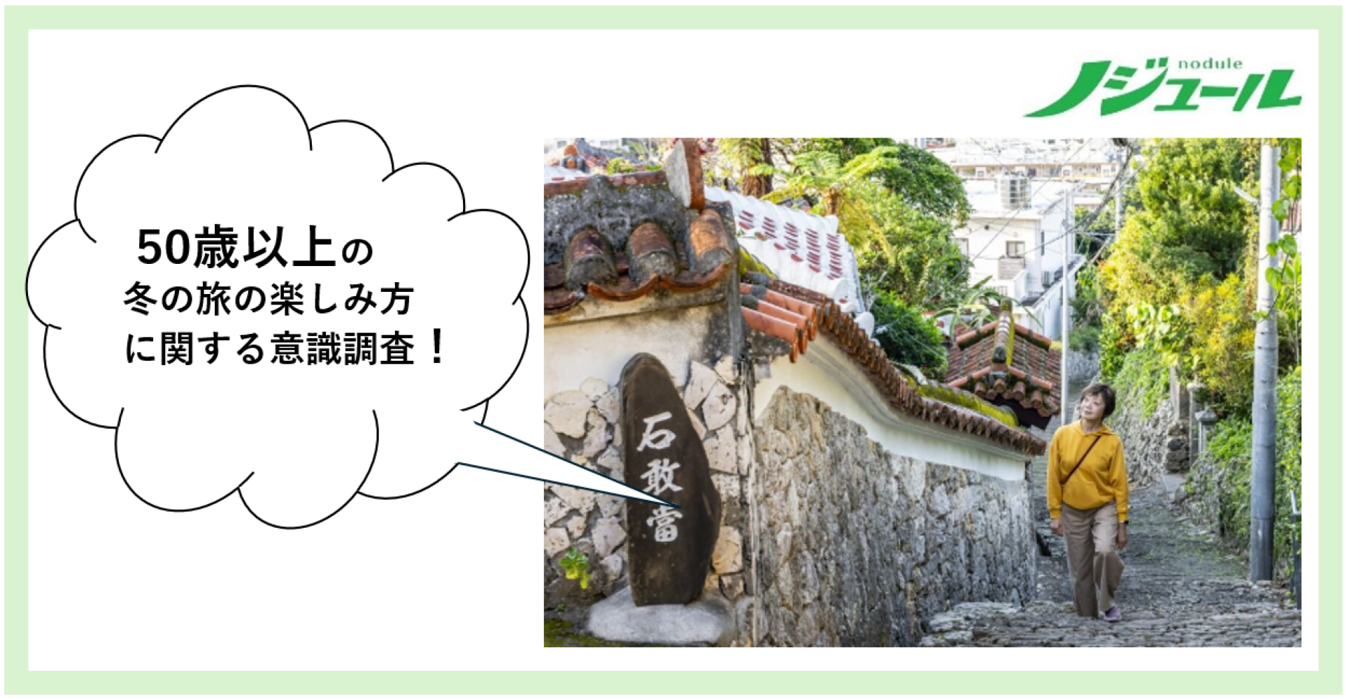 『ノジュール』は、2006年6月の創刊以降、街歩き、歴史、温泉、アートなど、50歳以上の旅と暮らしを豊かにする情報を発信しています。2月号の大特集「早春の沖縄へ、おとな旅」にちなみ、ノジュール読者に対して、「冬の旅の楽しみ方」についてのアンケートを実施しました。