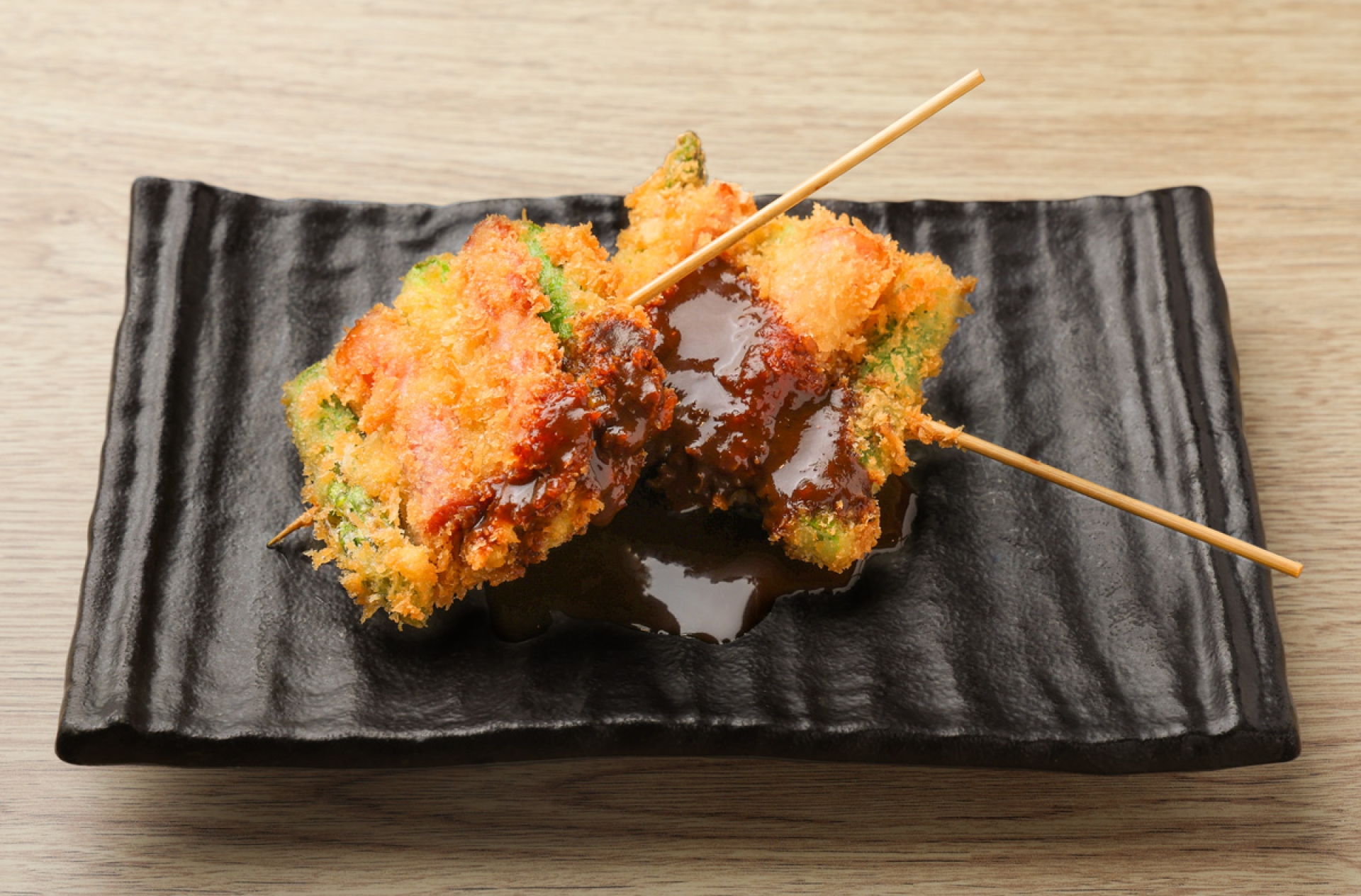 やわらかな豚肉と、シャキシャキのアスパラ、ジューシーなベーコンの組み合わせ。食べ応えのある串揚げでご提供します。