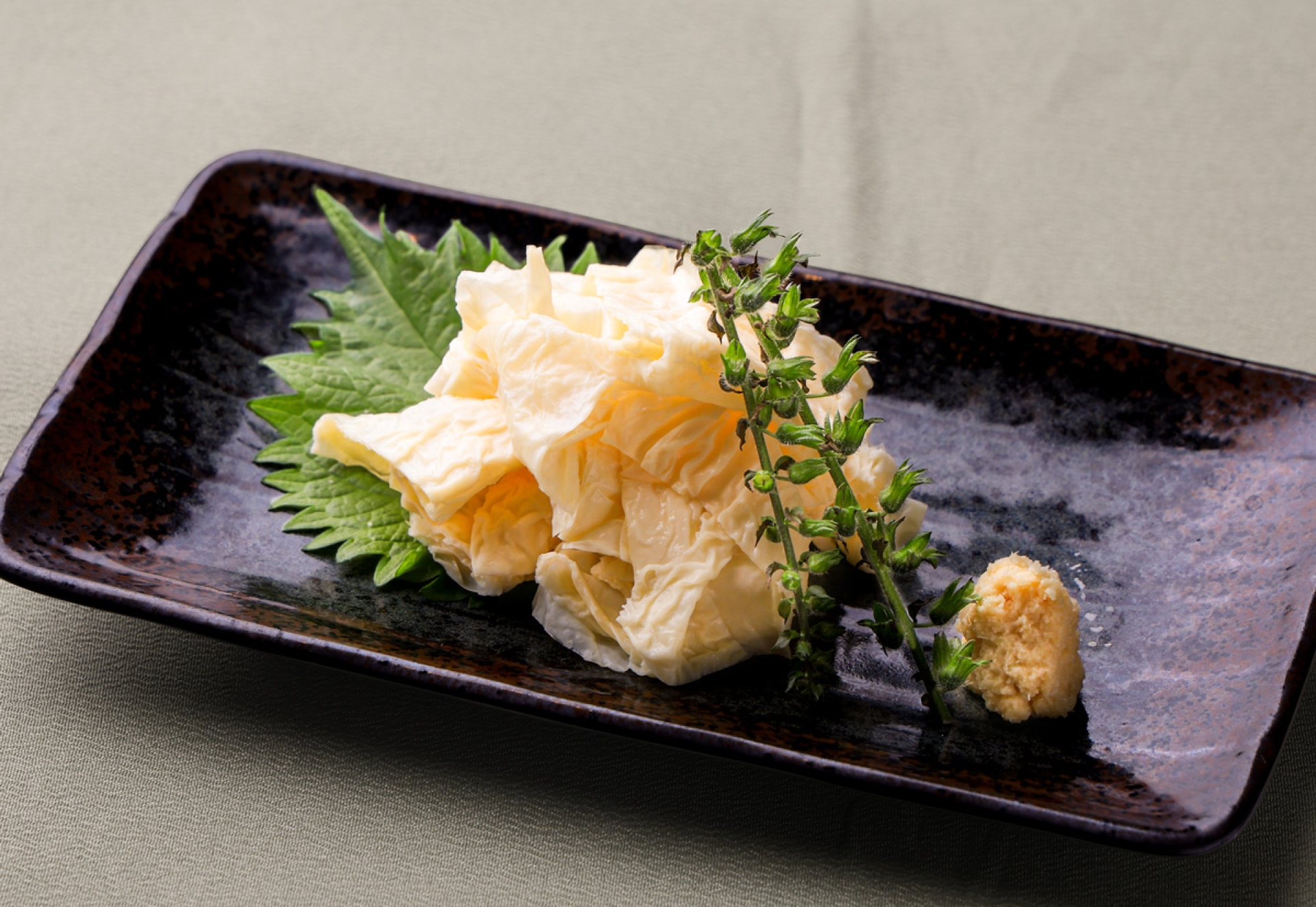 日光名物の日光湯波をシンプルに刺身で提供します。大豆本来のやさしい甘さと厚みがあるもちもちとした食感をお楽しみください。