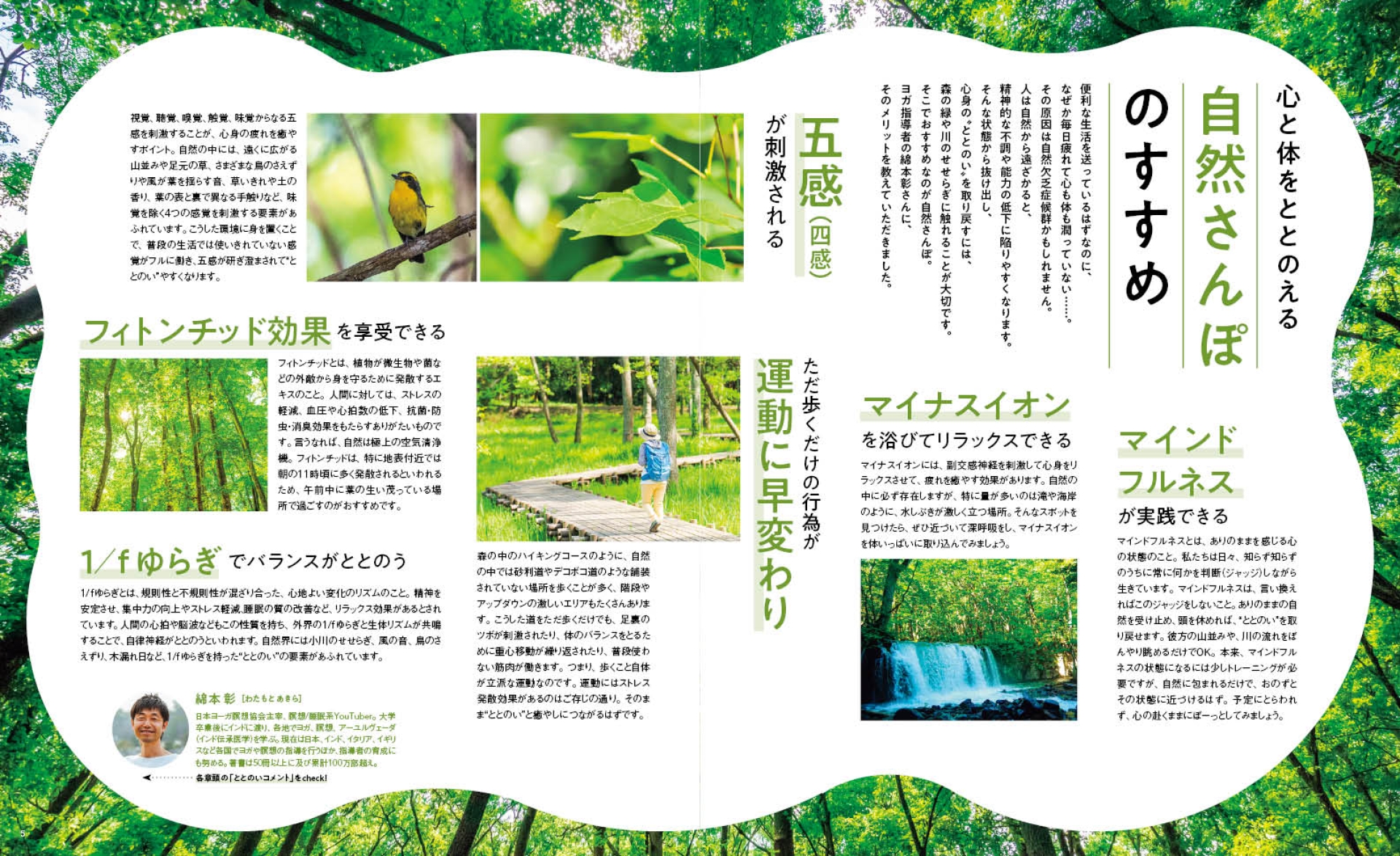 日本ヨーガ瞑想協会主宰で、瞑想・睡眠系YouTuberとして人気の綿本彰氏が監修。「心と体をととのえる呼吸法と歩き方」や「自然さんぽに取り入れたいヨガエッセンス」といった、自然をより深く味わい、心身を労わるための実践的なコラムを収録。自然と調和したウェルネスライフを提案します。