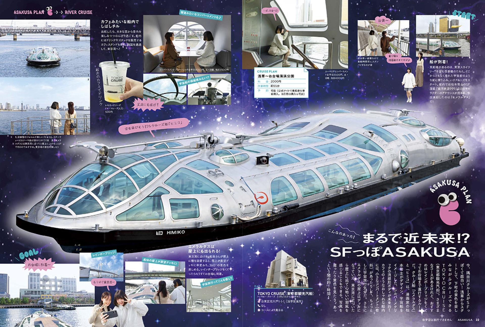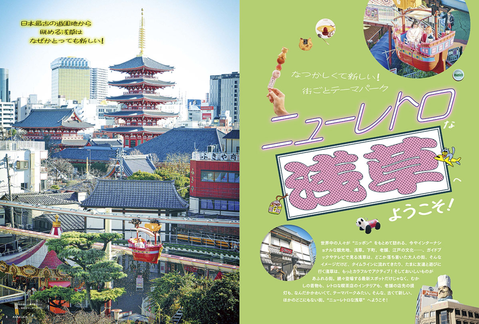 着物で映えさんぽ、SFっぽい船で隅田川クルーズ、射的に金魚すくい、ネオン輝く楽しい夜のめぐり方、日本最古の遊園地でレトロ遊び、かわいい工芸制作体験……。“街全体がテーマパーク”のような、今の浅草を全力で遊ぶプラン集です。