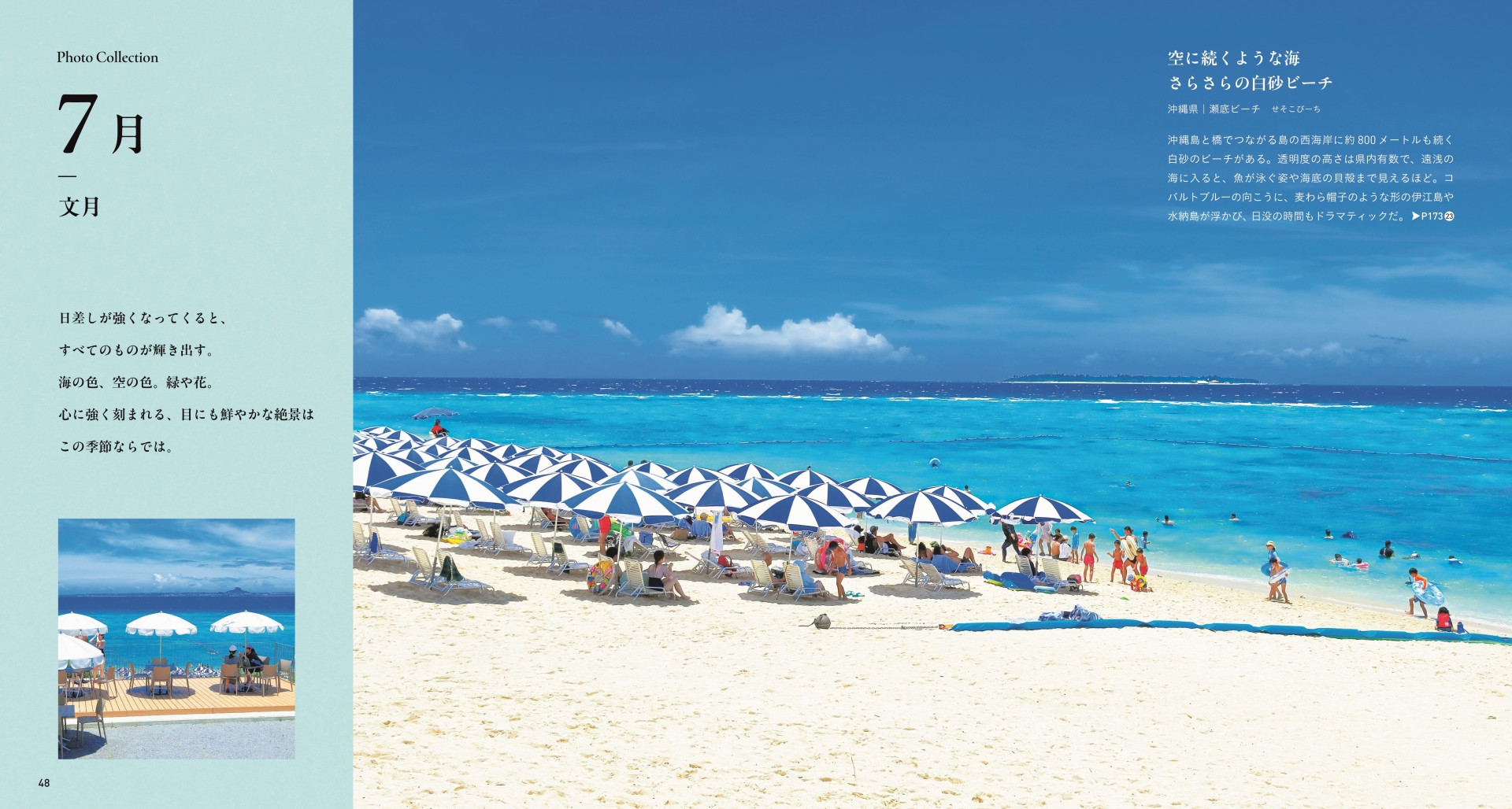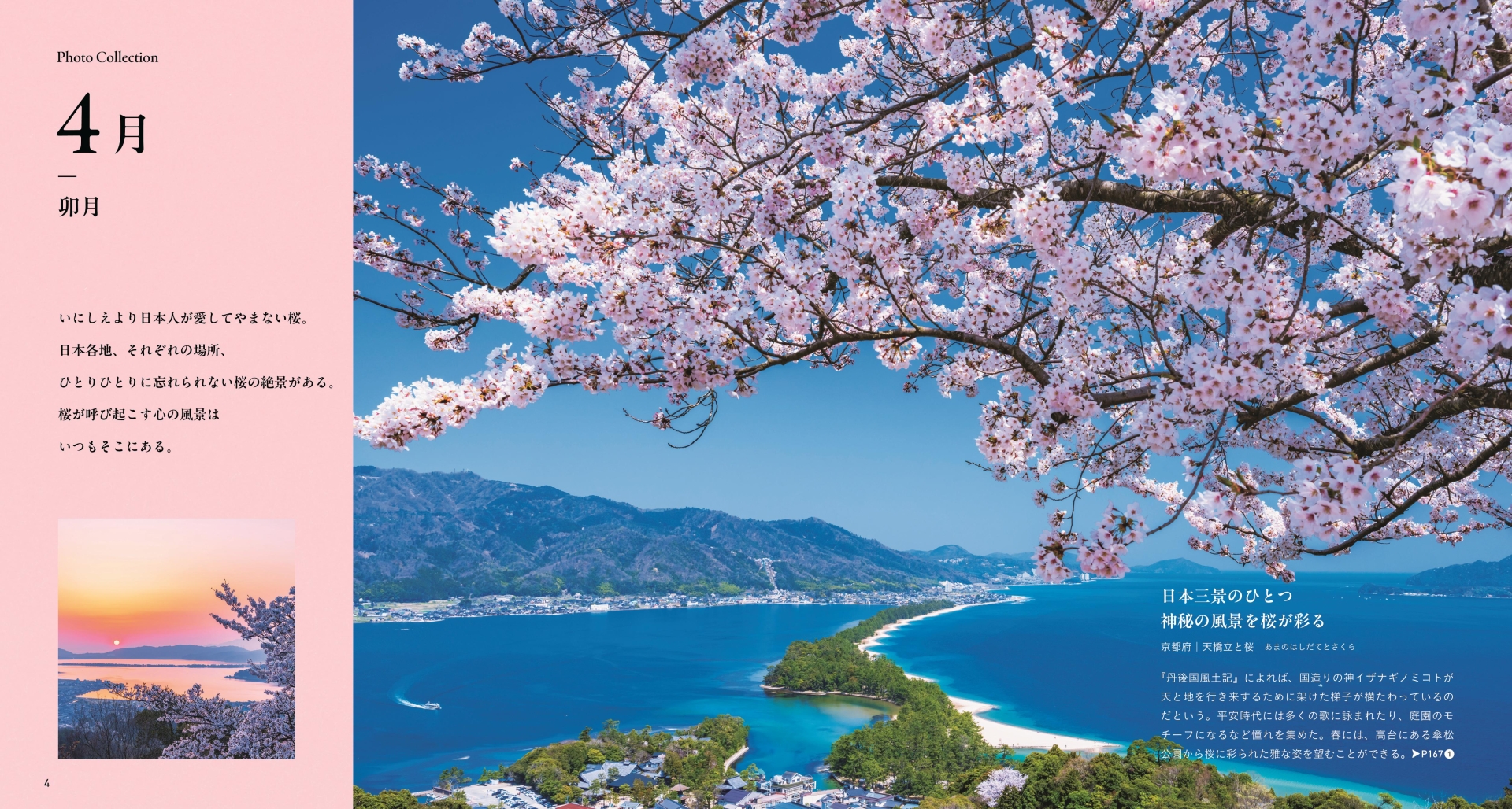 世界編では風情ある石畳、陽光にきらめく水辺、夕暮れに染まる丘の町、童話のような白銀の森……日本編では桜のトンネル、白砂のビーチ、真紅に染まる湖畔、雪に包まれた里山……など。季節の織りなす色や光が誌面いっぱいに広がり、月ごとの空気の移り変わりも感じられます。