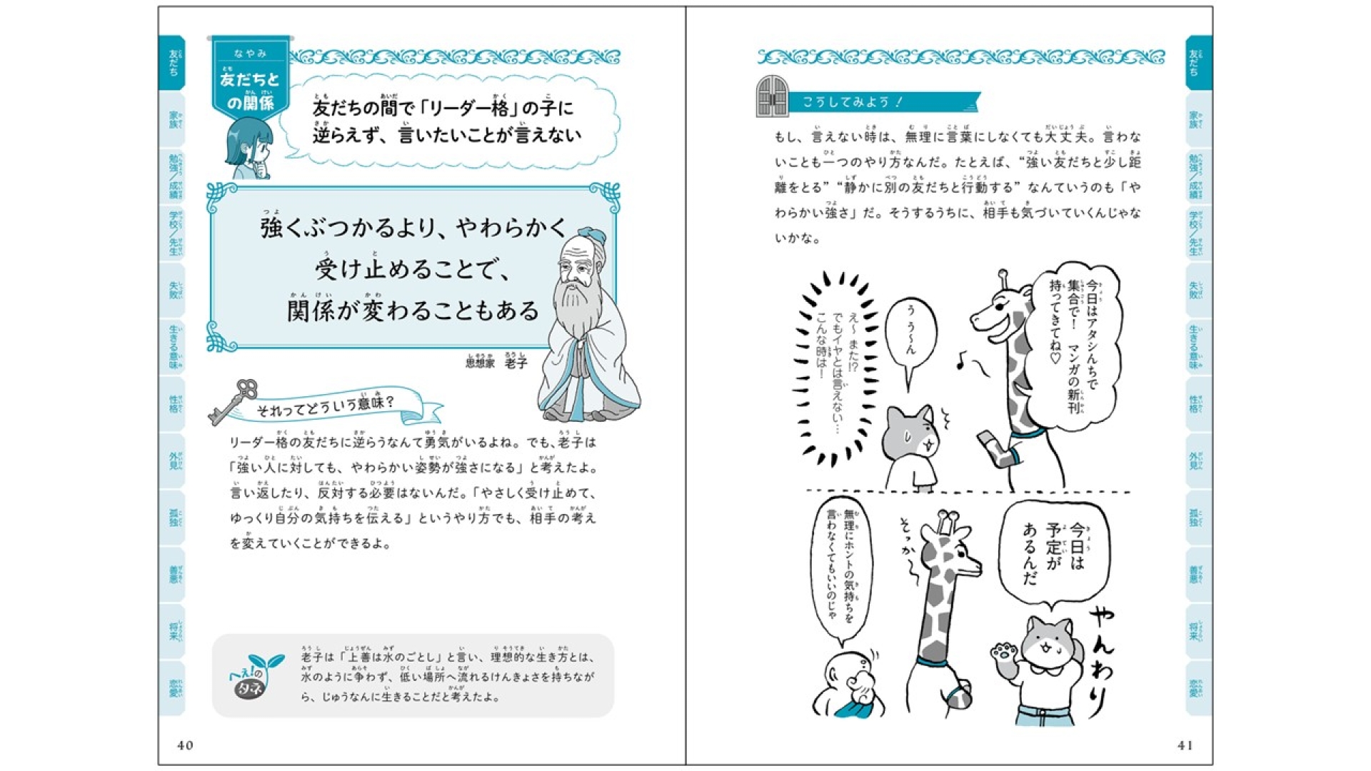 子どもたちが胸に抱える“言葉にならない悩み”に、世界の哲学者と心理学者の新しい視点を紹介します。監修者はスタンフォード大学・オンラインハイスクール校長の星友啓氏。アメリカの教育現場で「いま、子どもに必要なのは“哲学”である」という考えのもと、哲学を唯一の必修科目として教えています。今、非認知能力(自信、考える力、立ち直る力)を育てる教育が世界的に注目されており、新年度のスタートにふさわしいテーマです。