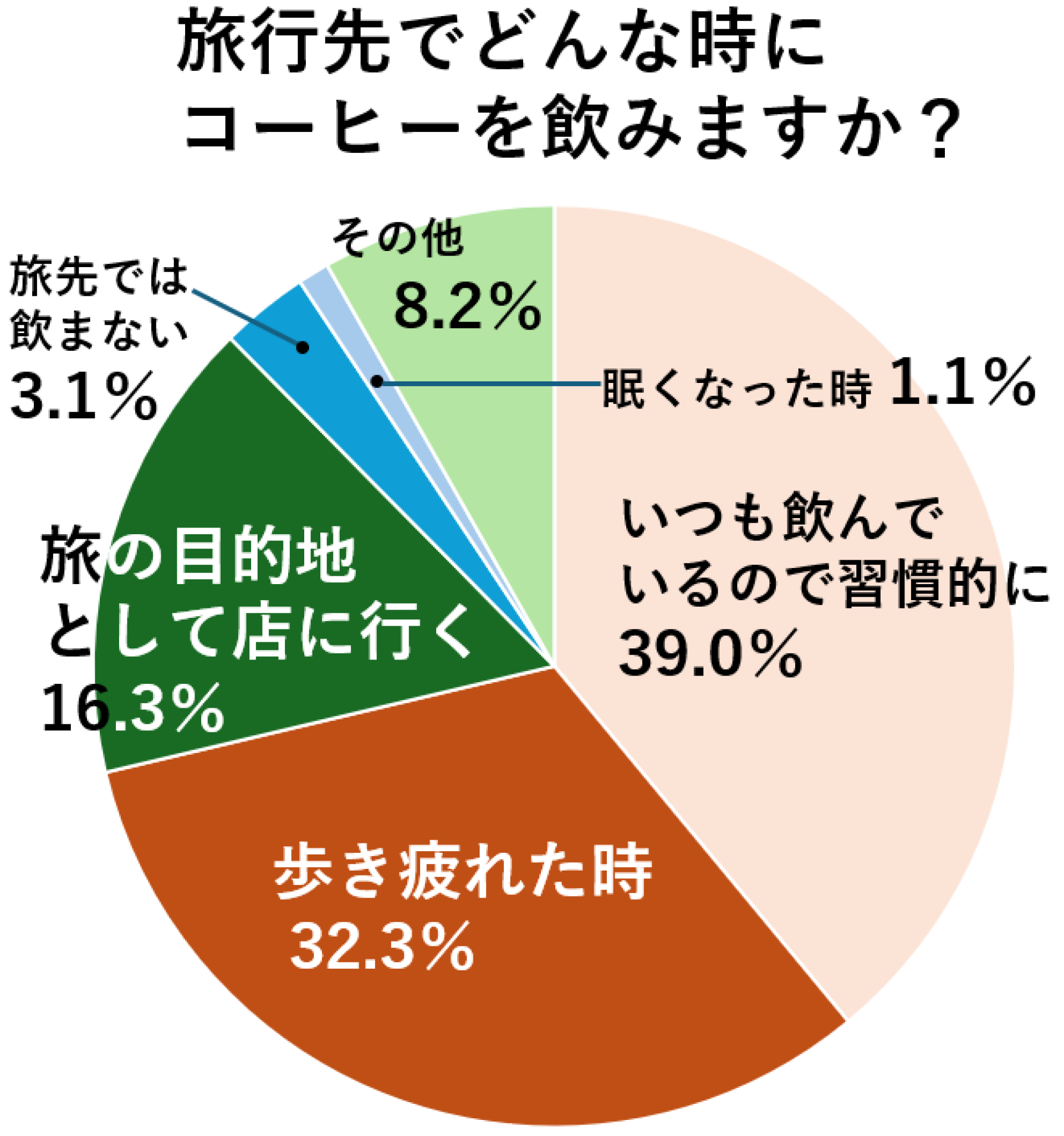 旅行中のどんな時にコーヒーを飲むのかを聞いたところ、一番多かったのが「いつも飲んでいるため習慣的に」(39%)でした。歩き疲れたから店舗で休憩がてらコーヒーを、という人は32.3%、旅の目的地として喫茶店やカフェを訪れるという人も16.3%いました。(n=1286)