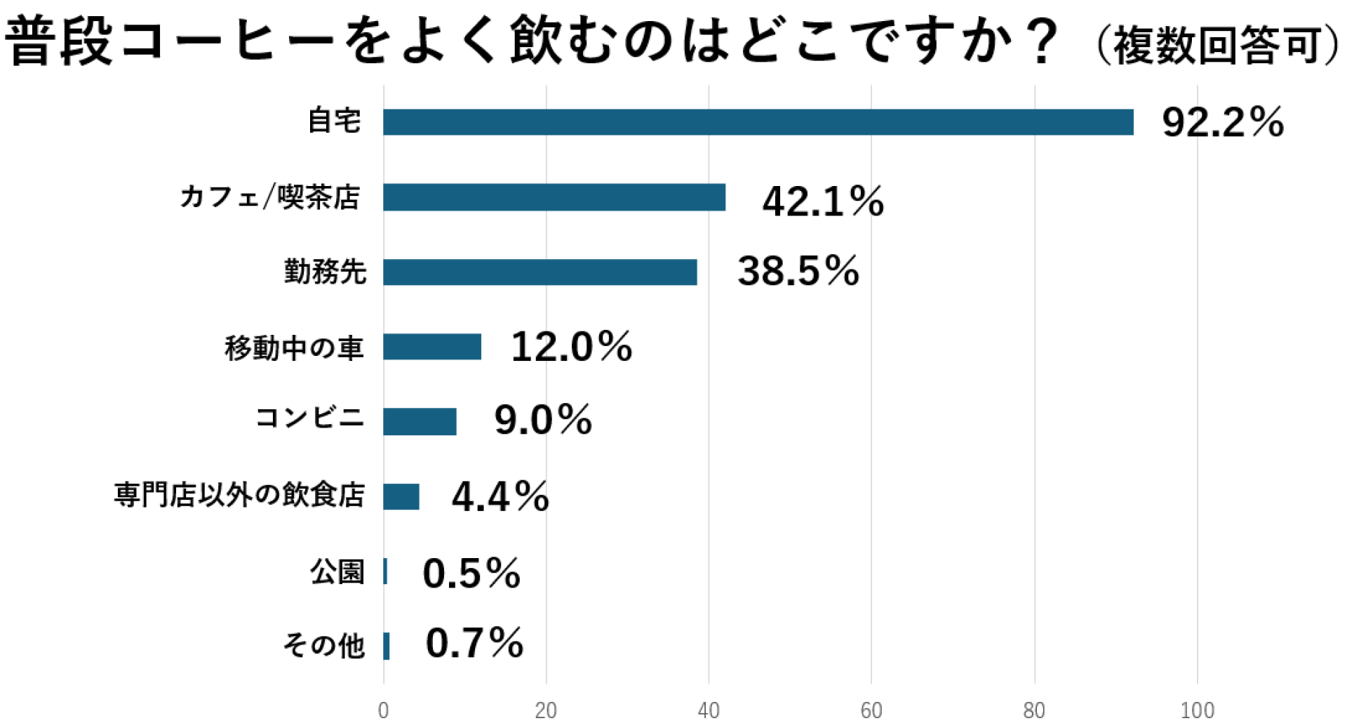コーヒーをよく飲む場所については、やはり自宅で飲む人は多く92.2%。他の場所では、カフェや喫茶店が42.1%、勤務先が38.5%といった回答が多く、テイクアウトして公園で飲む、といった人は0.5%と案外少なく、屋内でコーヒーを楽しんでいる人が多い傾向でした。(n=1286)
