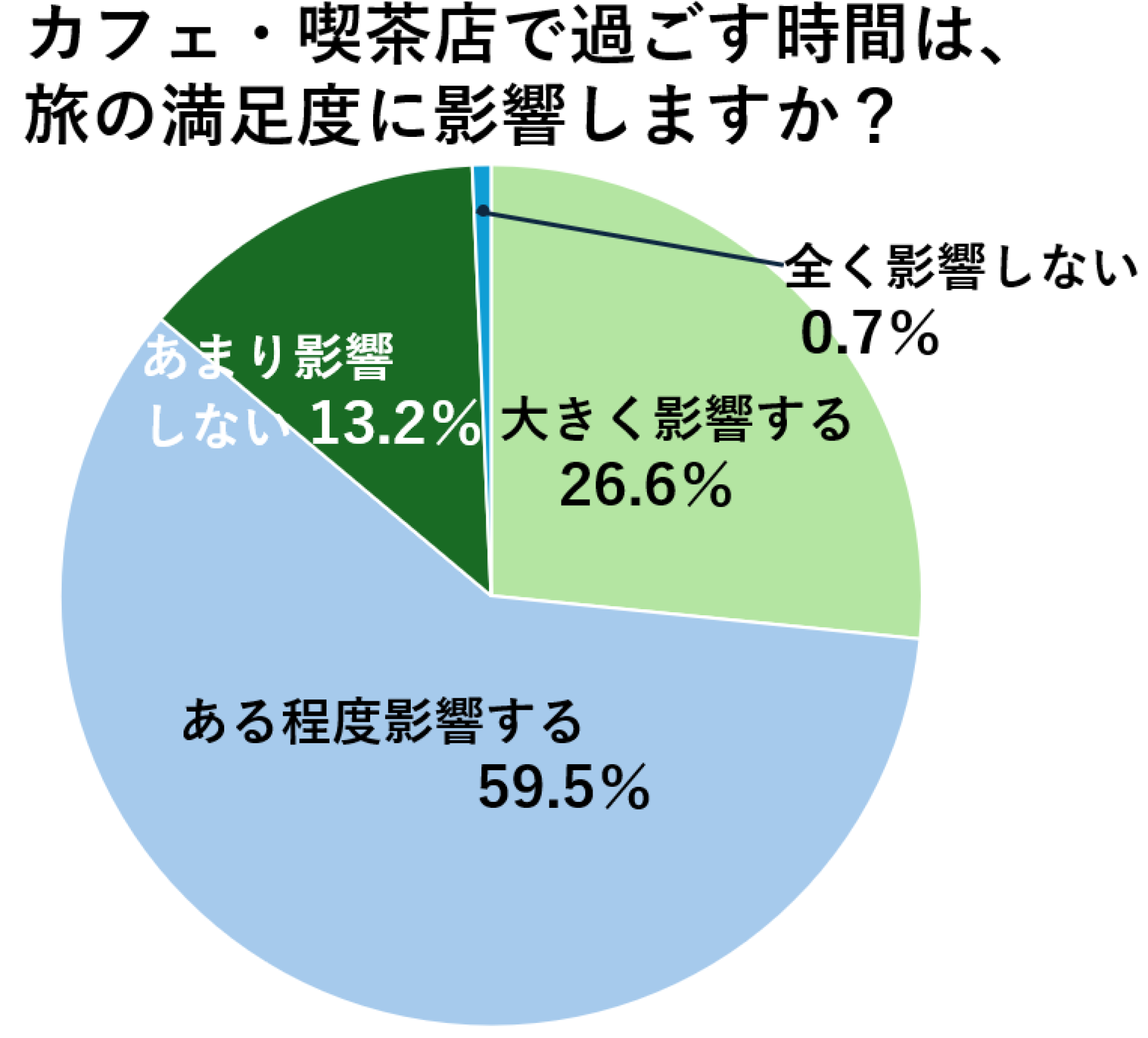 多くの人が旅先でのコーヒーを楽しんでいることが分かりましたが、カフェや喫茶店で過ごす時間が旅の満足度に影響するかどうかも聞いてみました。有効回答のうち大きく影響すると考える人は26.6%、ある程度は影響すると考える人は59.5%でした。合わせて86.1%の人が旅行先での癒やしのコーヒータイムが旅の満足度を向上させる要素だと認識していることが分かりました。(n=1107)